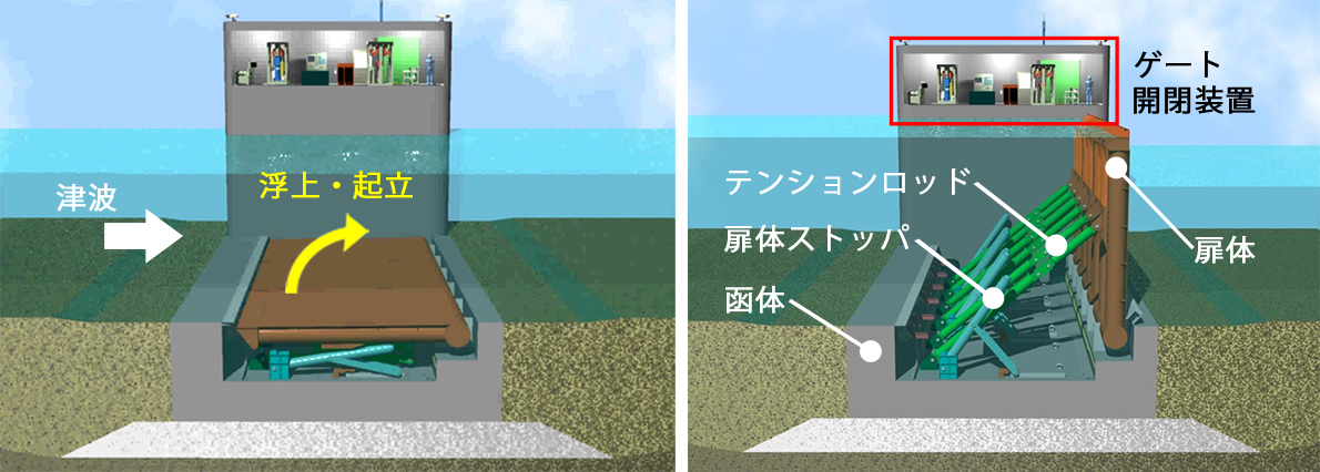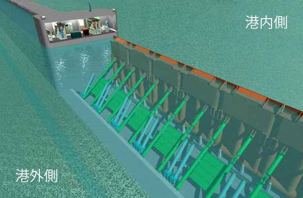 - ①自然の力活用による動力の小型化 津波・高潮に伴う港内外の水位差で扉体が起立するため、ゲート開閉装置がコンパクト。