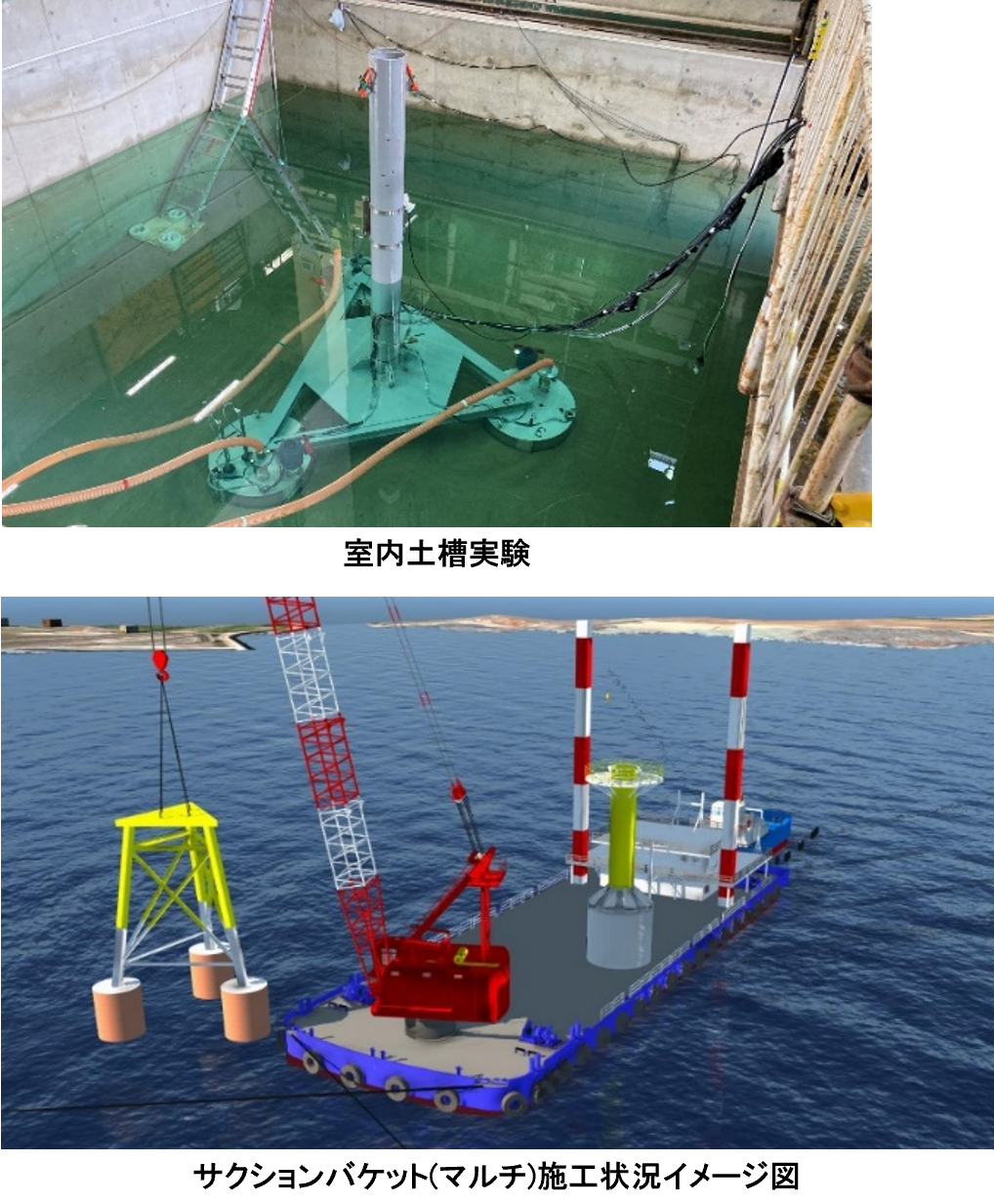サクションバケット基礎は、地中部に埋設されるバケットの数から「モノタイプ」と、「マルチタイプ」に分類されます。いずれも、バケット内部の排水による水圧を利用して貫入するため、施工に関する特徴は同じです。一方、風車搭載後の水平荷重に対しては異なる挙動を示し、杭基礎工法のモノパイル(単杭)とジャケット(多脚杭)の関係に類似しています。
