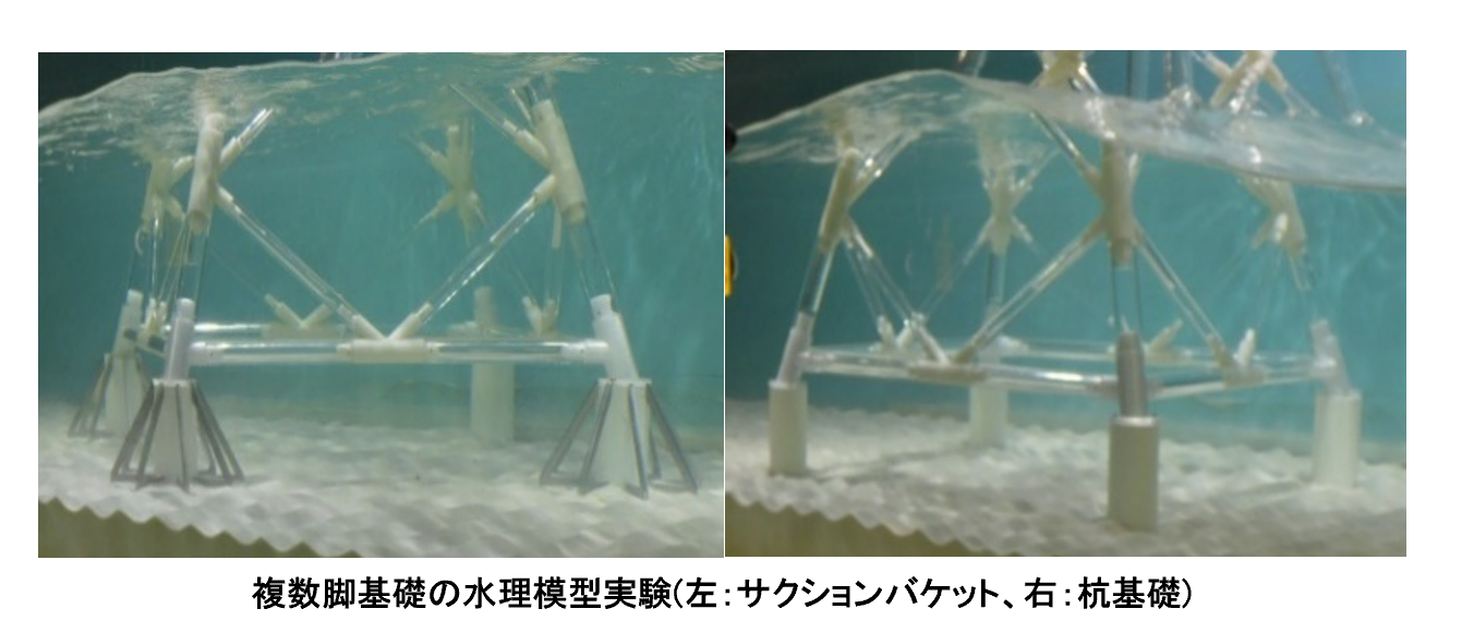 マルチタイプは近接して複数の脚が海底に設置されるため、モノタイプのような単脚式基礎と比べて基礎回りの水流が複雑となり、洗堀現象に対して互いに影響を及ぼし合うことが懸念されます。こうした洗掘特性を把握するため、水理模型実験をおこないました。