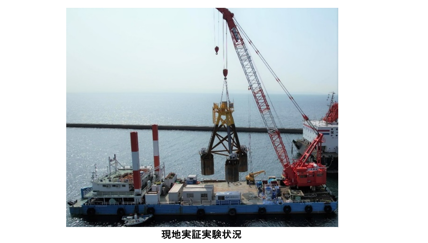 室内土槽実験を経て、より大スケールの模型試験体の施工性を検証すべく、実海域にて想定実機比1/5程度のサイズのサクションバケット試験体(マルチタイプ)の実証実験を行いました。